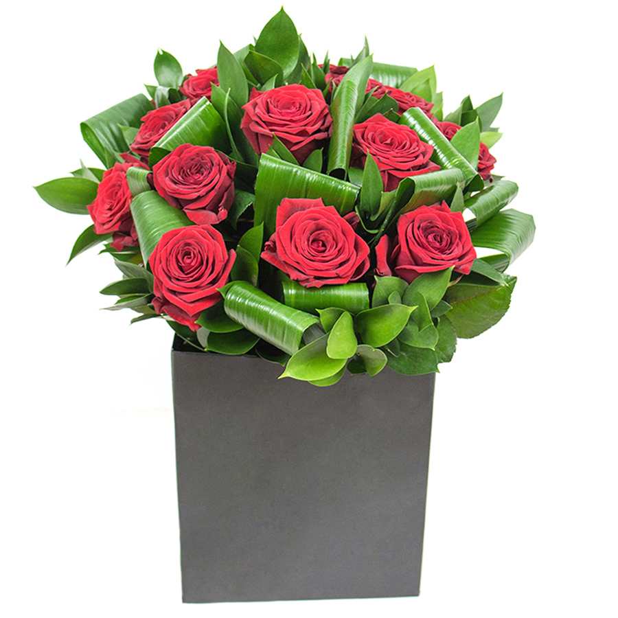 Illuminate any room with our Charming Red Rose & Greenery Bouquet. This sophisticated arrangement combines vibrant red roses, rich aspidistra leaves, and elegant ruscus, offering a unique and stylish display that captivates the eye.