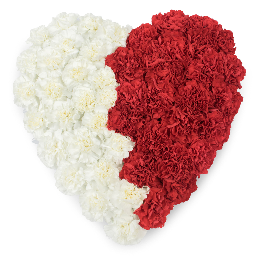 Handy Flowers presents the Premium Mixed Carnations Sympathy Heart, featuring a gorgeous combination of white and red carnations arranged into a beautiful heart shape to express your deepest sympathies.